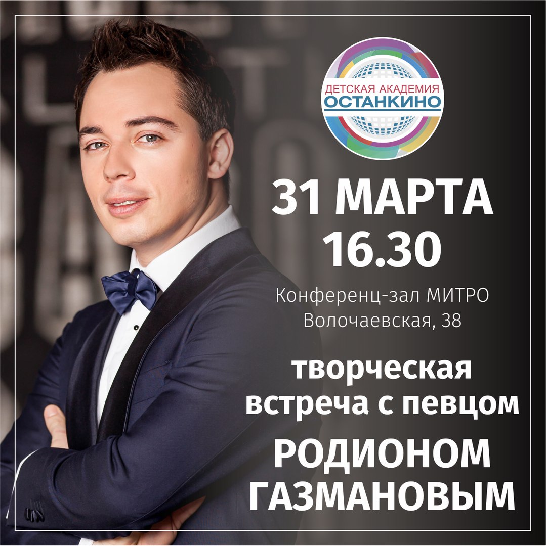 31 марта в Конференц-зале Главного корпуса МИТРО на ул. Волочаевской, 38 (усадьба Строгановых на Яузе) состоится творческая встреча с Родионом Газмановым, музыкантом, исполнителем, композитором. В рамках встречи гость МИТРО расскажет о своем творческом пути, ответит на вопросы и исполнит лучшие хиты вместе со своей музыкальной группой «ДНК». Родион Газманов – российский эстрадный певец, композитор, актер, солист и идейный вдохновитель музыкальной группы «ДНК», участник пародийного шоу «Точь-в-точь» и вокального шоу «Голос» на Первом канале. Приглашаются учащиеся Детской Академии «Останкино», а также студенты МИТРО и учащиеся Высшей Школы Кино и Телевидения «Останкино». Начало в 16.30! Запись на творческую встречу по почте: pr@mitro-tv.ru. |