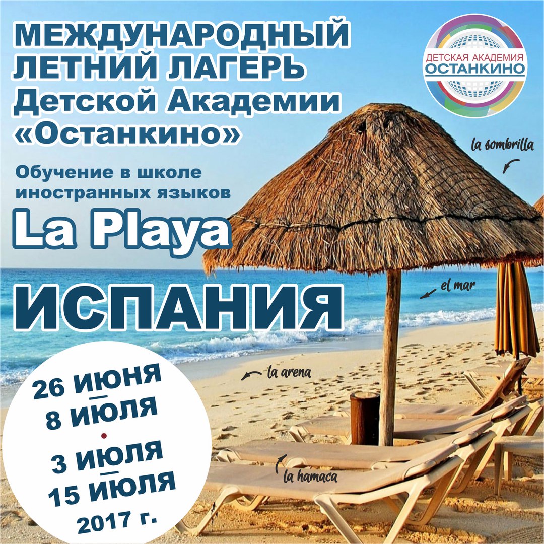 21.03.2017 - Набор в Международный летний лагерь «La Playа» в ИспанииВНИМАНИЕ! Детская Академия «Останкино» проводит набор в Международный летний лагерь «La Playа» в Испании! Срок обучения - 2 недели. Даты заезда: с 26 июня или с 3 июля 2017 года. Школа расположена в La Cala del Moral (юг Испании, Андалусия, провинция Малага) и является мировым лидером по качеству обучения иностранным языкам! «La Playа» предлагает изучение испанского и английского языков. Здесь дети и подростки совмещают учебные занятия с познавательными экскурсиями и активным отдыхом. Это прекрасная возможность встретить новых друзей и окунуться в андалузскую культуру. Внимание! Чтобы стать участником Международного летнего лагеря, необходимо направить заявку на почту: roditeli@mitro-tv.ru с пометкой «Летний лагерь в Испании». ВНИМАНИЕ! Заявки принимаются СТРОГО до 12 АПРЕЛЯ 2017 года (включительно). В заявке необходимо указать: 1. Ф.И.О (полностью). 2. Мастерская в Детской Академии «Останкино». 3. Номер учебной группы. 4. Телефон, E-mail. За дополнительной информацией обращаться к Анисе Казаковой, специалисту Детской Академии «Останкино» по телефону: +7 (965) 267-77-75. |