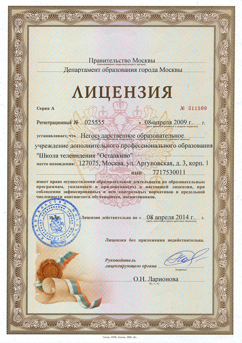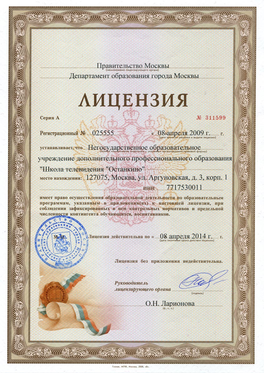 14.05.2009 - В Школе телевидения "Останкино" расширен перечень программ обучения!Уважаемые учащиеся и абитуриенты Школы телевидения "Останкино"! Информируем Вас о том, что Департамент образования города Москвы в связи с расширением перечня образовательных программ Школы телевидения «Останкино», выдал лицензию №025555 от 08 апреля 2009г. На основании выданной лицензии НОУ ДПО «Школа телевидения «Останкино» имеет право осуществлять образовательную деятельность по следующим образовательным программам: 1. Актерское мастерство